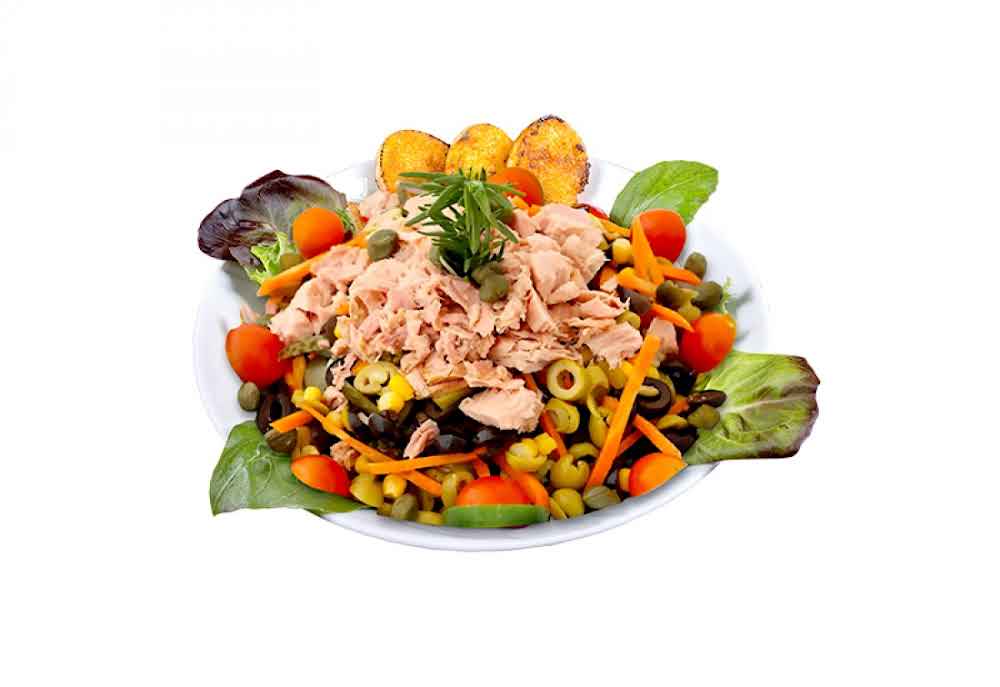Akdeniz yeşilliği, Çeri domates, Salatalık, Ton balığı, Mısır, Beyaz peynir