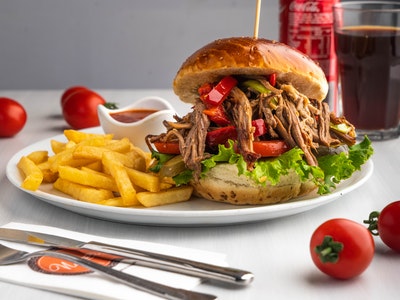 100 gr Dana Tandır Eti, Domates, Turşu, Yeşillik, Ketçap, Mayonez Yanında Patates Kızartması ile