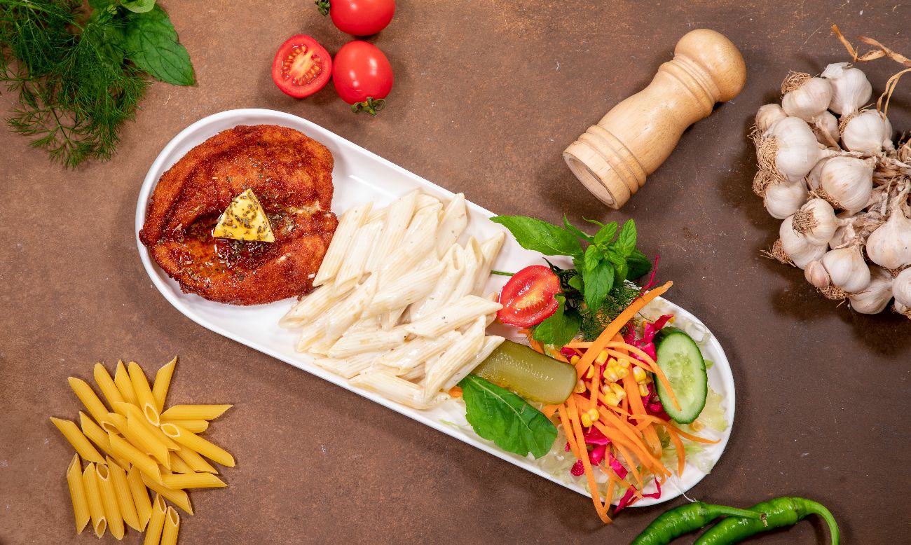 Panelenmiş Tavuk Göğüsü, Makarna, Yeşillik