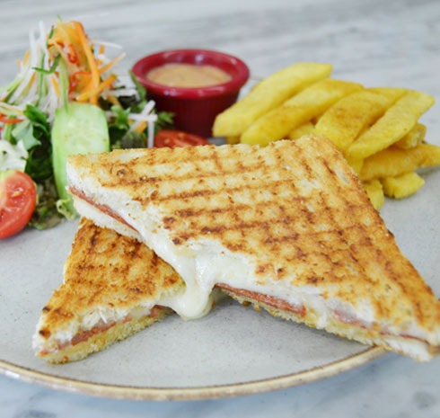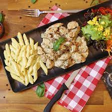Tavuk parçaları,kaşar peyniri,domates,yeşillik,ketçap ve yanında patates kızartması ile
