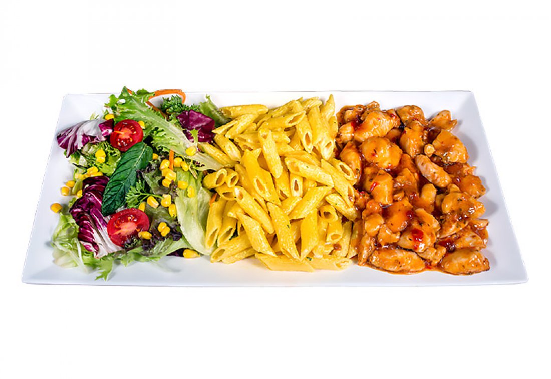 Tatlı Soslu Tavuk Parçaları, Makarna, Yeşillik