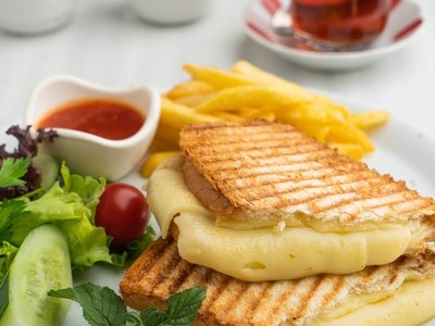 Izgara köfte parçaları,kaşar peyniri,domates,yeşillik,mayonez ve yanında patates kızartması ile