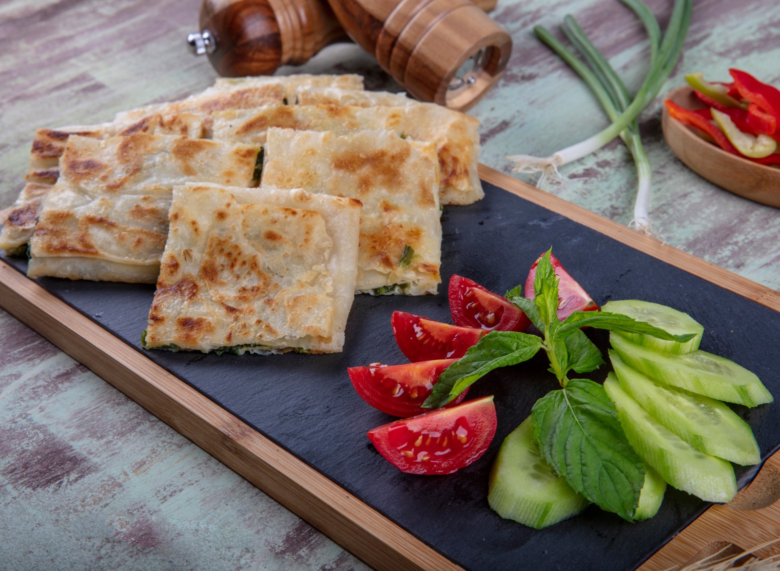 Yufkaya sarılmış kıymalı ve sebzeli çıtır börek yanında yeşillik ile servis